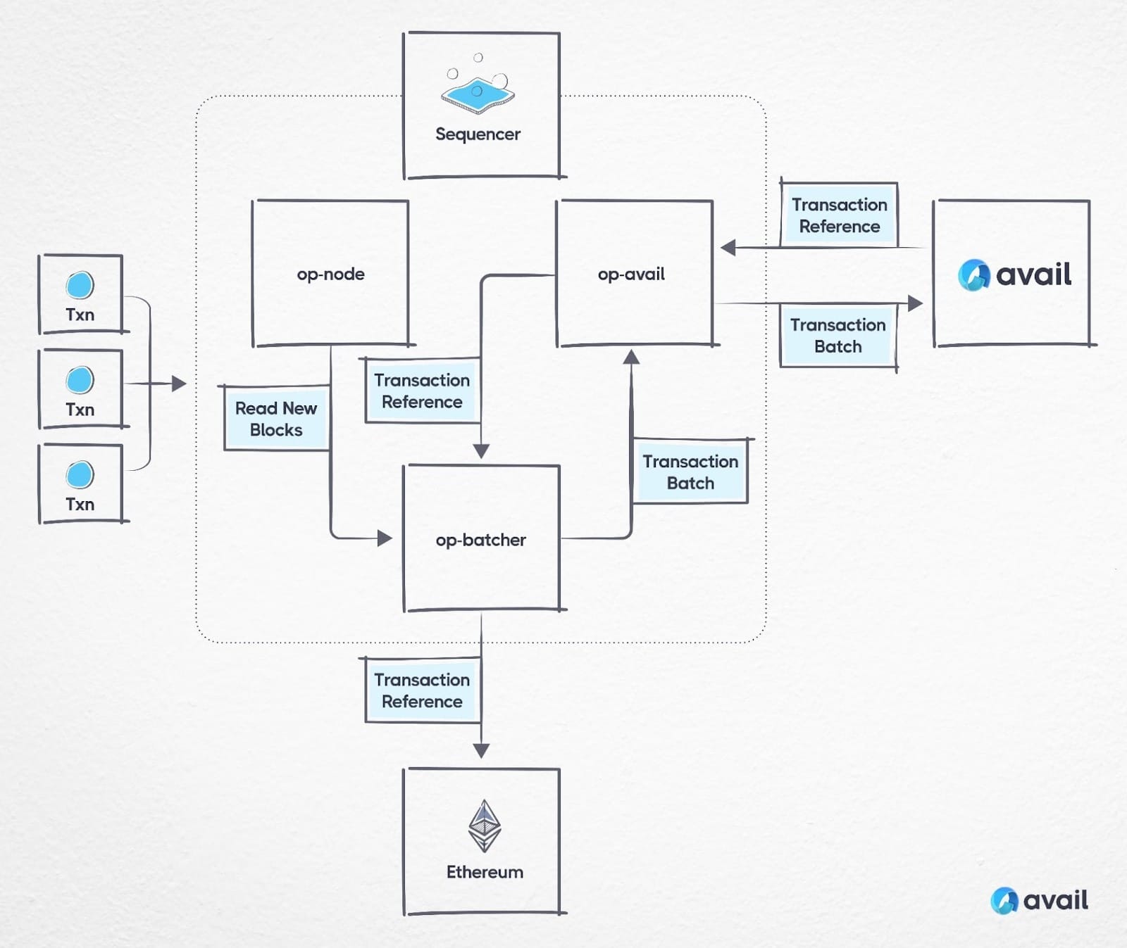 The transaction data is then added to the Avail blockchain and a transaction reference is returned to op-avail which is passed to the op-batcher and submitted to Ethereum as calldata/blobs. The transaction reference posted on Ethereum contains the Avail block hash, sender’s address and nonce of the extrinsic.